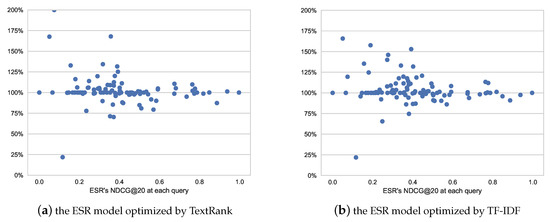 The enhanced model’s relative NDCG@20 compared with ESR on individual queries. Each point corresponds to a query in the ESR dataset. The X-axis marks the ESR’s NDCG@20 of the query, and the value on the Y-axis is the enhanced model’s relative NDCG@20 (percentage) compared with ESR.
