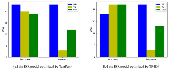 The W/T/L on short queries (only one entity) and long queries (more than one entity). The X-axes mark two query levels, and Y-axes are the W/T/L values.