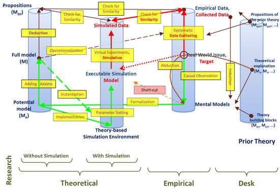 Figure 1, slightly redrawn from [19], shows an expanded framework to extend the logic of the basic model of the modelling and simulation process in ([9], p. 17) which only contained the items and arrows marked in red in the new diagram. The “Abstraction” arrow (now dotted) connecting the “target system” (the real world issue in Figure 1) to the “model” (the executable simulation model in the new diagram) was replaced by a chain of arrows (now in green) from the real world issue via a mental model, a potential model and a full model in the sense of the non-statement view of the structuralist program [12] and a theory-based simulation environment to the executable simulation model.