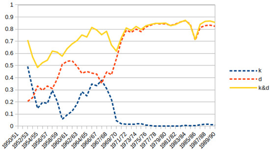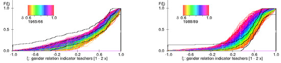 The simulation results showed that or, to be more precise, the “measure of validation” ([39], p. 163), namely the variance of is so well explained by and that at least an estimation of the historical values of these two GDS-theoretical terms became possible which revealed that during the first two decades of the documented period the strategy applied was to segregate men and women (and also boys and girls), leaving a bimodal frequency density function, whereas in the third decade the influence of and itself decreased and became unimodal, still being high but still below the equal opportunities level of 1.0, whereas the fourth decade saw a decrease of both values, such that the allocation of applicants to schools became more and more gender-independent, and equal opportunities were not achieved (Kraul, M.; Wirrer, R. ([27], p. 322) even state that “the primacy which female teachers used to have in girls schools was given up in the process of establishing coeducation, but no kind of `compensation’ was achieved” (italics in the original, my translation) . As this happened only during the last few years of the observed period and no further data could be collected, the allocation strategies after 1990 cannot be evaluated with the help of GDS.