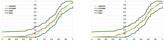 Simulated cumulative frequency distribution (red) for a run with and and one school year—1967/68—and its 80 per cent conficence band (dark green) and the expected cumulative frequency distributions (light green) for the resulting and (left) and with and corresponding to and (right).