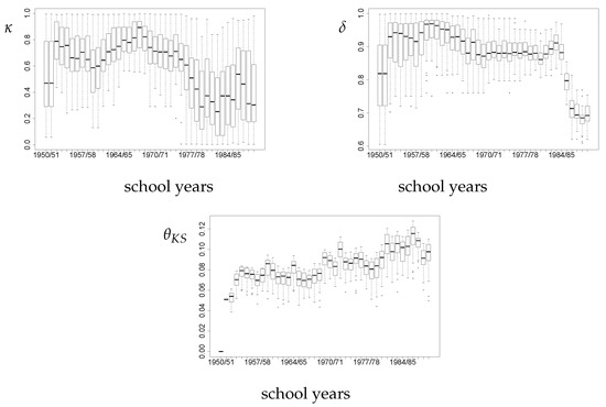 This is why Figure 6 gives only boxplots for , and for those 50 runs and the school years which showed the smallest value for . As a consequence of the relative small influence of on (see Figure 5) the boxplot for shows very large ranges and quartile differences for most of the years; one can, however, see that in early years values around 0.75 prevailed whereas during the final 15 years was only about 0.4. The series of shows high values about 0.95 from the mid-1950s until the mid-1960s, a slow decrease to 0.85 during the second half of the 1960s, stability for the next one and a half decades and from 1983 till 1986 a steep decrease to less than 0.7. The selected 50 runs for each school year are sufficiently similar to the observed data, as is always below 0.12. This means that, according to the Kolmogorov-Smirnov two-sample test, the null hypothesis does not need to be rejected for all these runs which were used to find estimates for and , and that all these runs yielded cumulative distribution functions lying well within the 80 per cent confidence band [36], ([37], chapter 7), the half width of this band being 0.14209 for a sample size of 114. Examples for the 80 per cent confidence band for two years are shown in Figure 3 which uses the conversion from x to to be compatible with the relation between switching function and probability density function mentioned by [29]. There is no simulation run whose simulated distribution is within the 80 per cent confidence band around the observed distribution for all years; only run 441 with and produced distributions for all years up to 1977/78 within this confidence band (which is clearly in line with what can be observed in Figure 3).