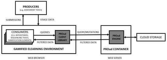 On the client side, the developer has to download the PROud client library (encoded in JavaScript) and reference it in the learning environment (PELE) code. The library can be used by two types of components: (1) Producers: responsible for generating the usage data. Typically producers will be Integrated Development Environments (IDEs) and evaluation tools. The library receives this data and sends it to the server; and (2) Consumers: responsible for using the library to obtain server-specific usage data, in order to create new gamification elements or enrich existing components.