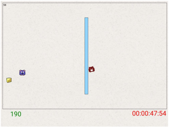 The first game, Cat vs. Mouse (Figure 1), combines physical movement and cognitive stimuli. The idea was based on previous studies which implied physical exercise and game play have positive effects on elderly [18,19,20]. The main aim of the game is to control the mouse character to catch cheese chunks by tilting an Android mobile device. The game contains a time limit (one minute) in which the player tries to get as many cheese chunks as possible. After getting a cheese chunk, the player gets points and another cheese chunk appears in different location. After getting five cheese chunks, an opponent (a cat) appears and starts to follow the player (the mouse). New cats appear after five more cheese chunks, while also making the first cat faster. The game ends after the mouse hits a cat or the time expires. There is also an impenetrable obstacle in the game to add difficulty.