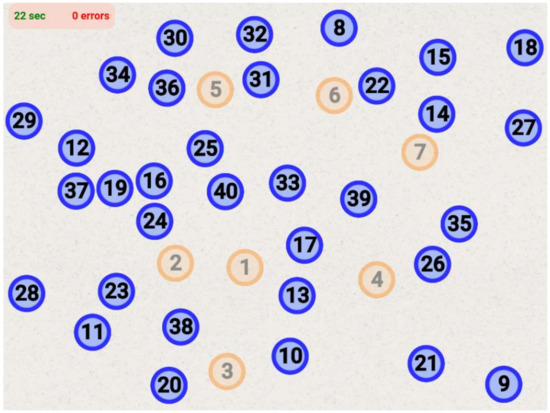 The second game used in this study is based on the Trail Making Test (TMT) which consists of 25 numbered circles (from 1 to 25) in random order on a sheet of paper. The aim is to draw lines to connect the numbers in ascending order as quickly as possible, without lifting the pen or pencil from the paper. The time taken to finish this task is measured. Longer times indicate greater cognitive impairment [21,22,23]. The game version (Figure 2) mimics the test, but the numbers are on a tablet screen and the player must tap the numbers in ascending order. Correctly selected circle turns transparent, and incorrect taps are indicated by the incorrectly selected circle flashing red. The game ends when all circles are tapped in the correct order, or after four errors. The difficulty level can be changed in the game menu by adding or removing digits on screen.