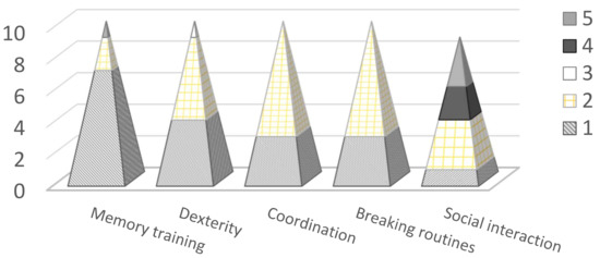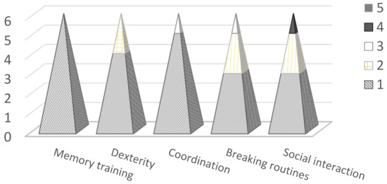 In China, the game was immediately accepted and all participants were able to understand the logic of each game. The players were asked to grade how much they felt playing these games would benefit memory training, dexterity, coordination, breaking routines and social interaction in their lives on a scale of 1-5, where 1 is “very beneficial” and 5 is “inadequate”. These results are presented in Figure 3. Based on the results, these games were seen to benefit memory training, in addition to dexterity, coordination and breaking routines. On the other hand, the effects on social interaction were not seen to be very beneficial. One player did not wish to comment the effects on social interaction.