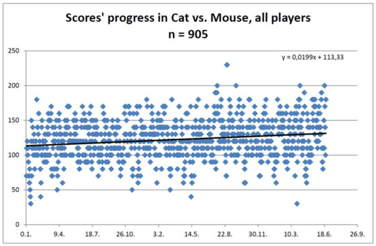 In this section, gaming scores and gaming activity are discussed, and results from the automatic data collection are provided to further investigate the effect of the games. Firstly, the Cat vs. Mouse game scores are discussed. Figure 5 presents the data from the Chinese trial. Overall, the Chinese game results were improved over time, the regression line equation being 0.0199x + 113.33. In Finland the Cat vs. Mouse game scores also indicated improvement, the regression line equation being 0.4998x − 20.626 [17]. It was concluded that three months of daily playing in Finland resulted in improved games scores compared to the Chinese participants. However, slight improvement was also seen in the trial with weekly frequency in China. It should be noted that Chinese players were slightly younger (with an average age of 84, whereas the average age in the Finland study was 90) and game scores were already higher in the beginning; average game scores during the first day were 95.6 (China) and 48.2 (Finland), which may indicate better cognitive skills or better skills in using touch screen devices. However, in Finland the games and the tablet were described as easy to use without any major problems, which implies that technical skills did not crucially affect the result. The total number of playing times was larger in China compared to Finland, despite the different setting: 905 times in China and 726 in Finland.