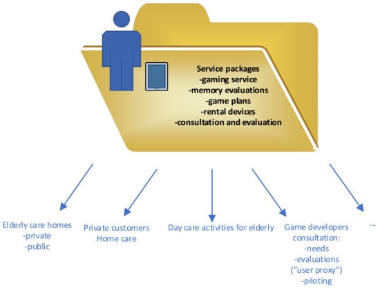 Another rather rarely researched field is the actual implementation of games into an elderly care context, from a service development point of view. Other kinds of information and communication technology (ICT)-related health services (eHealth, telehealth, mHealth) are researched more commonly [12,13]. The concept of this study could be categorized under mHealth. Typical mHealth services include data collection and communication by mobile devices via the Internet, but sensors/measurement devices may also be included. In addition, mHealth services typically include remote consultation/action or feedback from a service provider (i.e., a health care professional). For example, questionnaires or self-measurements are sent to the health care professional before/during/after a care process, which makes the care more efficient and more accessible (especially useful in rural areas) [12,13].