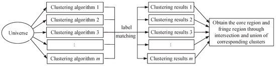 The above procedure can be depicted by Figure 3. Finally, we present Algorithm 1, which describes the proposed three-way ensemble clustering based on hard clustering results. In Algorithm 1, we choose the first clustering results as matching criterion and match the other clustering results with during label matching.