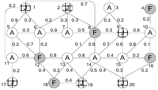 We focus on the undirected weighted labeled graph as shown in Figure 1, which can be represented as a tuple (V, E, T, L (V), W). Each node denotes an entity in some network, and V is the set of nodes. Edges denote the relationship of nodes and E is the set of edges. T is a set of node types. and L (V) is the label value of node V, which is used to represent some characteristics of the node (entity). Edge weights represent interestingness between nodes and W is the set of edge weights. In Figure 1, taking the authors’ cooperative relationship network of the DBLP as an example, it contains three types of entities that of the author, research field, and journal. Graph labels A, F, J represent different types of nodes and edges and show the relationship among the three types. The edge weights are used to express the degree of cooperation between authors, some author’s published rates in some journals or the similarity between research fields, and so on.