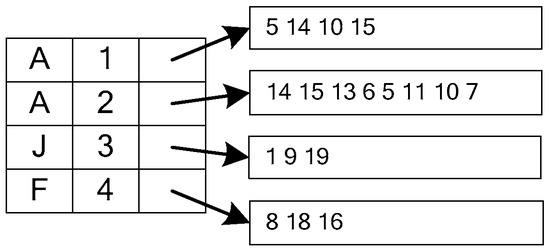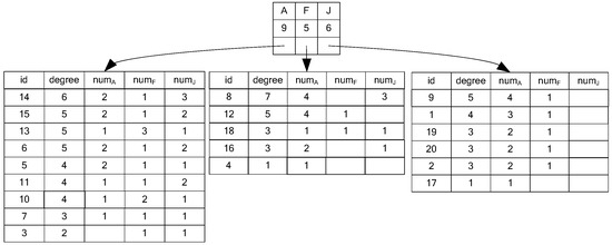 The top-level index item of the NTF is composed of the <node label type, the number of nodes belonging to the type>; the bottom-level index item is composed of the <node id, node degree, and the number of adjacency nodes for each type>. We use the breadth first algorithm to calculate the properties of the label type, degree, adjacency node type and number. Greater node degree provides more and more valuable information in the process of query and matching. Therefore, in this paper, the index items are listed in descending order by node degree. Taking the example of Figure 1, the data graph G contains nodes of type A, F, and J. And its NTF index is shown in Figure 3.