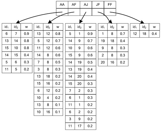 The top-level index item of the EF index is composed of <edge type>, and the bottom-level index is composed of < edge endpoint 1’s id, edge endpoint 2’s id, weight >. The Top-K interesting subgraph query is to query the K highest interestingness score of matching subgraph in data graph G according to query graph Q, and it is known from the definition of interestingness score that it increases with the increase of the edge weight. In this paper, the EF index is listed in descending order to effectively filter edges that do not meet conditions. Still taking the example of Figure 1, the data graph G contains the edges of five types, which are AA, AF, AJ, JF, and FF, and its EF index is shown in Figure 4.