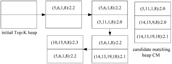 The concrete process of the initial matching-verification is shown in Algorithm 3. The algorithm maintains a Top-K heap for storing the K matching results with the largest interesting score in descending order. A candidate matching heap CM is maintained for storing the matching results in ascending order that have been verified and placed in the Top-K heap but replaced by subsequent matching results and that have been verified and not placed in the Top-K heap.