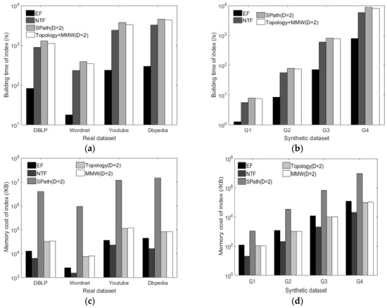 Figure 8a,b show the comparisons of construction time for different indexes on synthetic datasets and different real datasets. The RAM algorithm needs to construct the SPath index, and the RWM algorithm constructs the Topology and MMW index. We find that the construction time of each index increases as the graph scale increases. The construction time of the EF index is much smaller than others, because it only needs to sort edges of different labels, without having to compute complex node relationships. The NTF index is significantly better than the Topology + MMW (D = 2) and SPath index, because the NTF index only needs to traverse the data graph once to obtain the relationships among all nodes and their adjacency nodes. In addition, the Topology + MMW (D = 2) and SPath index are constrained by D, and the construction time of index will grow exponentially with increasing D.