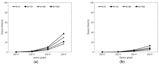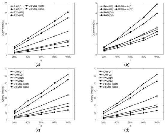 Figure 9a–d show the comparison of the query time based on the different real datasets when K = 10. We abstract each dataset into a data graph G. The parameter n (n = 20%, 40%, 60%, 80%, 100%) is the ratio of the nodes contained in the subgraph randomly extracted from the data graph G to the original data graph. In the experiment, for the unweighted query graph (Q1) and weighted query graph (Q2), we observe the query time of each algorithm is changed as the data graph scale increases. Among them, Q1 is obtained when the query graph Q shown in Figure 2b removes weight, and Q2 is the query graph Q shown in Figure 2b, and D = 2 in the index of RAM and RWM. For the weighted query graph, the algorithms of RAM and RWM need to query all the matching subgraphs and then to filter the subgraphs that do not meet weight limit conditions. But the DISQtop-k algorithm has filtered out the nodes and edges that do not meet conditions when the candidate set is filtered, which avoids the repeated calculation. So, the DISQtop-k algorithm runs faster and grows flatter. To ensure each query has at least one match result in the data graph, we generated every query graph by randomly extracting connected subgraph from the data graph.