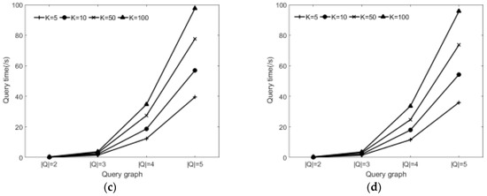 Figure 10a–d show effect of varying query graph and the K. From analysis we know that the node number of query graph and the setting of K value have some influence on the subgraph query time. Figure 10 shows the query time comparison of DISQtop-k for different scales of the query graph Q and varying K values. We find that the query time of each algorithm increases when increasing the query graph scale and K. The query time for varying K values is less volatile when the query graph Q is fixed. We also generated each query graph Q by randomly extracting connected subgraph from the data graph.