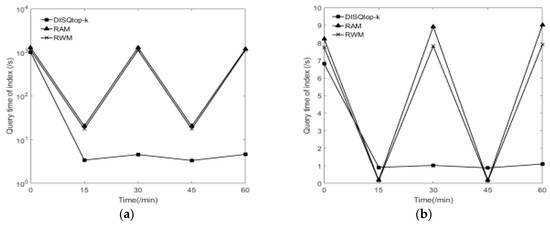 Figure 11a–d show the comparison of index dynamic maintenance time when the ECOS of different scales is collected during the jump time ∆t of the sliding window. As shown in the figure, each index increases as the ECOS scale increases. For the update speed, EF + NTF index is obviously faster than Topology + MMW (D = 2) index and SPath index. Because the DISQtop-k algorithm directly stores the data graph in the EF index and NTF index, and it only needs to update the ECO directly in the ECOS to the EF index and the NTF index when indexes are dynamically updated. However, there is no dynamic processing mechanism in RWM and RAM algorithms, so dynamic query can only be realized by the static processing method and indexes need to be recreated every time indexes are updated dynamically.