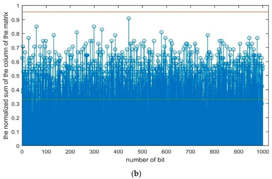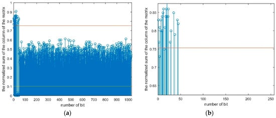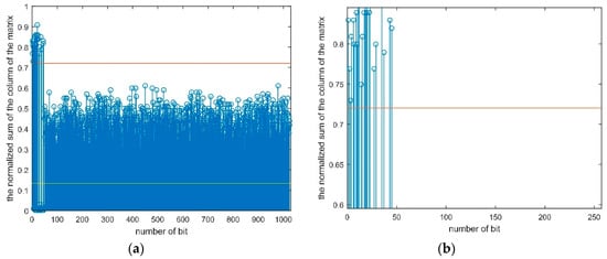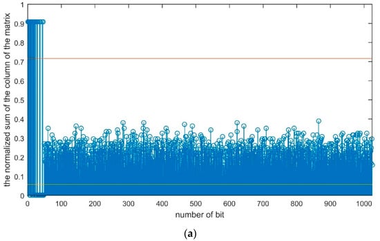 When the number of matrix columns l is equal to the frame length, all elements of certain columns are either 0 or 1, while elements of other columns are randomly occurring as 0 or 1. The former ones are defined as synchronization columns, while others are defined as non-synchronization ones. The sum of each column is calculated, based on the results of which it can be recognized as a synchronization column when the result of a column is closed to 0 or u. Therefore, reasonable thresholds have to be elaborately designed [7,8].
