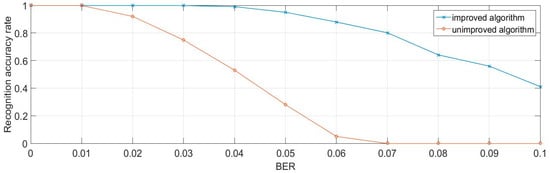 As the result shows, when the BER is over 0.03, the recognition accuracy rate of the unimproved algorithm is lower than 0.8, while that of the improved algorithm is 1. When the BER increases to 0.1, the unimproved algorithm can hardly recognize the frame parameters. However, the improved algorithm in Section 4 still works at the recognition accuracy rate of 0.43.