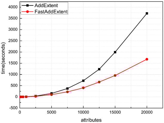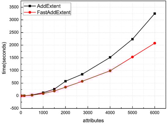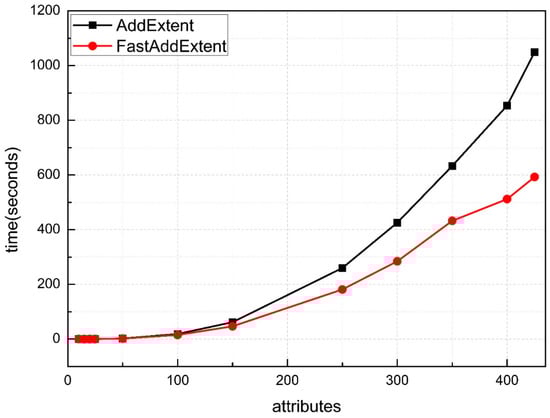 Figure 6 depicts the comparison between the FastAddExtent algorithm and the AddExtent algorithm on a 40% fill ratio (high density) data set. As we can see from the figure that the number of attributes is increased gradually from 10 to 425. Because the size of the concept lattice is very large and the consumption of memory resources is very fast, we can only run tests on 400 attributes. The line chart obtained from the experiment can be visually seen that the running time are rising rapidly. The intersecting point appears much earlier compared to Figure 4 and Figure 5. Meanwhile, the FastAddExtent has an obvious advantage at each test point.