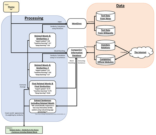 In addition to , let be the theme word and be set to 1. Under this condition, sentences of each company’s information including are extracted and the number of appearances of each word by each company is counted. Then, the final similarity of each company is defined with the following equation: