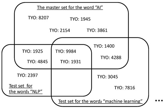 The first step involves selecting all companies whose information, e.g., investor relations (IRs) or official website we crawl via the Internet, includes the theme word. In the example in Figure 2, ten companies were selected for the word “AI”. The term “TYO: xxxx” means the ticker code of the companies on the Tokyo Stock Exchange. We call these ten companies a “master set”. The second step is almost the same as the first step. The difference is that the target word, which is searched in company information, is changed to . This means we also select companies whose information includes . In the same example, the “NLP” is included in the information of five companies. We call these companies a “test set” for . In the final step, are calculated with the following definition: precision of test set for to the master set. For “NLP”, only four companies in the test set are also included in the master set, so is . Other calculations are the same, such as .