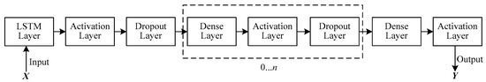 In Figure 1, the hybrid LSTM neural network structure consists of one input combination layer, zero or more intermediate combination layers and one output combination layer. The input combination layer includes a LSTM layer, an Activation layer and a Dropout layer. The intermediate combination layer includes a Dense layer, an Activation layer and a Dropout layer. And the output combination layer includes a Dense layer and an Activation layer. The input of the LSTM layer of the input combination layer is X, while the output of the Activation layer of the output combination layer is Y. The Dropout layer means that some neural units are temporarily discarded from the neural network according to a certain probability during the training process, preventing over-fitting.