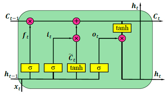 The LSTM layer consists of a series of LSTM units, called LSTM model [32]. Compared with other neural networks, the LSTM model has three multiplicative units, i.e., input gate, output gate and forget gate. The input gate is used to memorize some information of the present, the output gate is used for output, and the forget gate is used to choose to forget some information of the past. The multiplicative unit is mainly composed of a sigmoid function and a dot product operation, where the sigmoid function has a range of [0, 1] and the dot product operation can determine how much information is transmitted. If the value of the dot product operation is 0, then no information is transmitted. And all information is transmitted if the value of the dot product operation is 1. The LSTM unit [32] is shown in Figure 2.