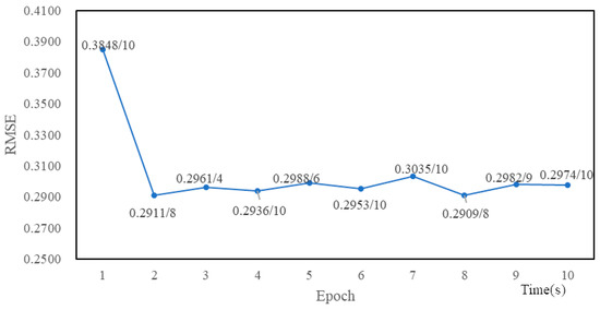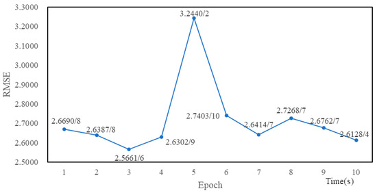 According to Figure 4 and Figure 5, when the number of neurons is between 1 and 10, the RMSE value gradually decreases to the minimum and then increases with the increase of neurons number. And when the neurons number is greater than 10, the RMSE value continues to grow, and the running time becomes significantly longer. Therefore, in the following epoch time and neurons number tuning experiments, the neurons number for each epoch time is fixed between 1 and 10. The results are shown in Figure 6 and Figure 7.