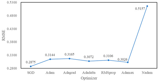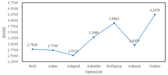 The optimization problem is to find a set of parameters for a given objective function, so that the RMSE value is the minimum. The commonly used optimizers include Stochastic Gradient Descent (SGD), Adagrad, Adadelta, RMSprop, Adam, Adamax, Nadam, etc. [39]. When tuning the optimizes in Keras, the hybrid LSTM neural network structure shown in Figure 1 only selects the LSTM layer, and the parameters of the LSTM layer are set to the default values. And the above optimal batch size, epoch time and neurons number are applied here. Figure 8 and Figure 9 are the RMSE values of different optimizers for Sample1 and Sample2 respectively.