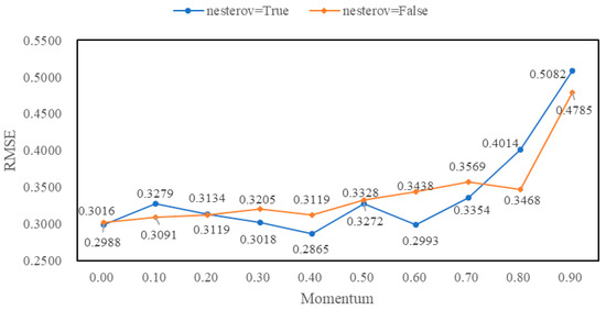 From Figure 8 and Figure 9, the RMSE value of Adagrad is the minimum for Sample1 when only the optimizer function is changed and the other parameters are kept as the initial default values. Similarly, the best optimizer for Sample2 is SGD. The learning rate of SGD generally has two values: 0.01 and 0.1, while the value of decay is generally 10−6. The RMSE value for Sample2 is 0.2875 when the learning rate of SGD is 0.01 and the RMSE value for Sample2 is 0.6786 when the learning rate of SGD is 0.1. Therefore, the learning rate of SGD for Sample2 is fixed at 0.01 in subsequent experiments. The momentum and nesterov values of SGD for Sample2 are then tested, as shown in Figure 10.