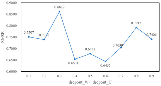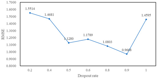 For the above hybrid LSTM neural network structure after tuning, the selection of dropout rate is mainly in both the LSTM layer and the Dropout layer of the input combination layer, and the Dropout layer of the intermediate combination layer. And the dropout rate of the Dropout layer of the intermediate combination layer is generally set to 0.5 [40]. To keep the input from changing too much, the dropout rate of the Dropout layer of the input combination layer is generally set to close to 1. Figure 15 is the RMSE values of the different dropout rates of the Dropout layer in the input combination layer for Sample1.