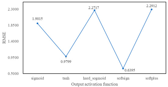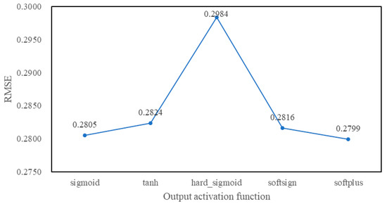 The output activation function here refers to the activation function of the Activation layer of the output combination layer in Figure 1. Based on the above network structure and parameters selected, the output activation function is tuned in Keras. Figure 17 and Figure 18 are the RMSE values of different activation functions for Sample1 and Smaple2.