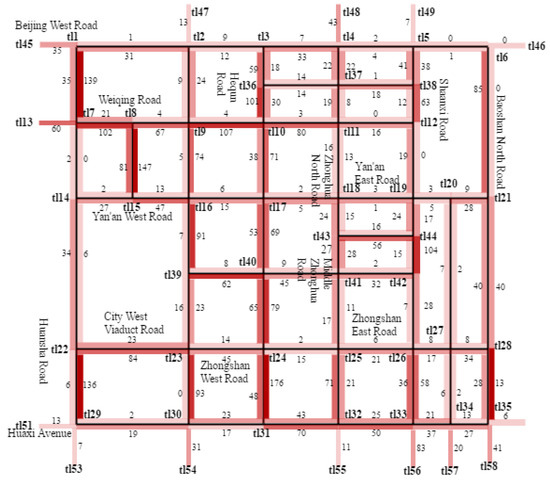 The thermodynamic diagram of the actual vehicle flow of each road intersection of the road network shown in Figure 3 from 18:00 p.m. to 18:05 p.m.