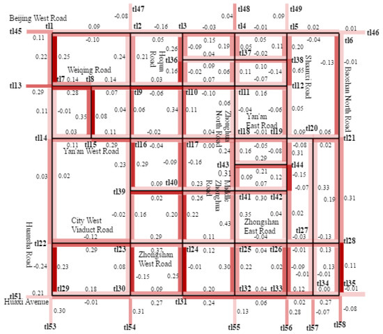 To verify the effectiveness of the above hybrid LSTM model in the whole road network, the above hybrid LSTM model is further applied to each road section of the road network shown in Figure 3. Figure 19 is a thermodynamic diagram of the actual vehicle flow of each road section of the road network shown in Figure 3 from 18:00 p.m. to 18:05 p.m. The deeper the color, the greater the traffic flow.