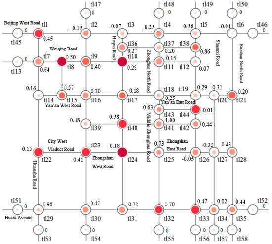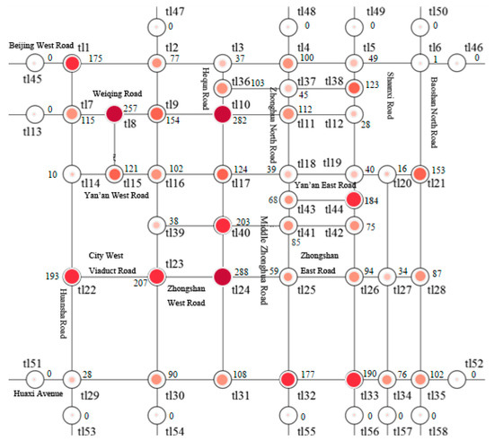 In Figure 20, the absolute errors between the actual and predictive vehicle flows of both directions are marked at each road section of the road network. Because the vehicle flow at a road intersection is formed by the vehicle flows of the connected road sections, the actual and predictive vehicle flows of a road intersection can be calculated according to the actual and predictive vehicle flows of the connected road section. Figure 21 is a thermodynamic diagram of the actual vehicle flow of each road intersection of the road network shown in Figure 3 from 18:00 p.m. to 18:05 p.m. The deeper the color and the larger the color block in the circle, the greater the traffic flow.