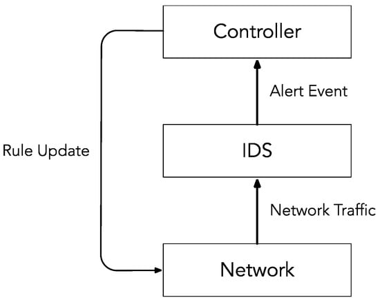 The system operates via a loop control among three basic architectural components (Figure 1): the network, the IDS, and the controller. The network represents all the data traffic and where a potentially DDoS attack might be launched. The IDS represents our DDoS attack detection mechanism, which analyzes all the traffic exchanged across the network. As the IDS detects an ongoing DDoS attack, the IDS notifies the Controller. After the Controller is notified by the IDS, the Controller transfers to the networking devices of the data path of some new flow rules for restoring the normal operation of the network as quickly as possible.