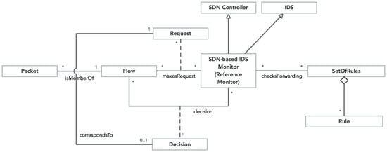 Figure 2 shows the conceptual model of the current work. Our proposal combines the functionality offered by both an SDN controller and an Intrusion Detection System (IDS). By aggregating these two entities, we have obtained an SDN-Based IDS Monitor. Each new Packet that arrives to the system (i.e., it was received in the switch’s port) is classified as belonging to a Flow and makes a Request to the system. In this way, the switch processes the received Packet according to a Rule associated to the Flow that Packet belongs to, making a Decision. In the case, the switch does not initially have any Rule for that Flow, then, the switch requests it to the SDN controller. The SDN controller installs the correct flow Rule in the switch which permits the Packet to proceed to its destination only if the packet belongs to a “well behaved” flow. Otherwise, a dropping Rule is installed in the switch. In this last case, the packets of the “bad” flow are discarded. The flow classification as “good” or “bad” is made by the IDS using a set of pre-configured rules. Each Request that is involved in a Flow results in a Decision from the developed system.