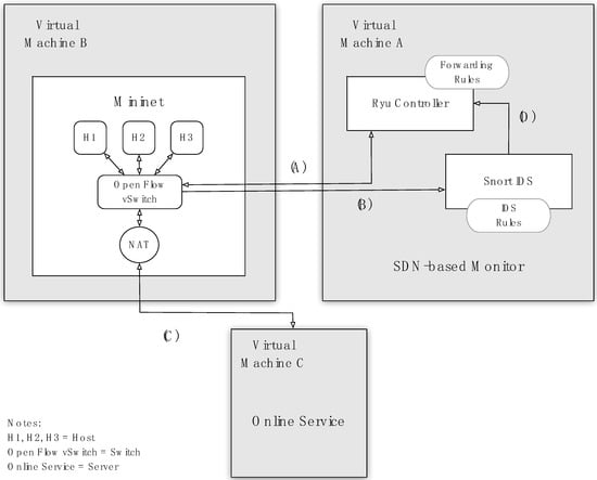 VM B emulates the network domain (e.g., home network) where a potential cyber-attack can be initiated. It runs a network emulator (i.e., Mininet) which deploys a network domain with some hosts, the software-based switch, and the NAT routing device. The software-based switch runs the OpenFlow protocol client part and belongs to the data plane of our testbed. This switch performs port mirroring and sends the entire traffic to the Snort IDS via link (B). The NAT device is used as a gateway for the hosts having access to the online server through link (C).