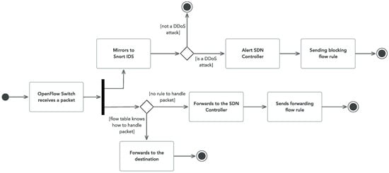 To deploy our SDN-based IDS (see Figure 5), we have aggregated the offered functionalities of an SDN controller and an IDS. The SDN controller is based on the open-source Python solution designated as Ryu []. We have coded within this controller a Python function designated as process_snort_alert. This function processes alerts received from the IDS. If the received alert is detected as a “Ryu block”, then that function sends a blocking flow rule to the Switch to otherwise ignore it. We have also used a well-known IDS, Snort []. It detects attacks based on known rule signatures. We have configured Snort by editing the files snort.conf as well as ddos_detection.rules to consider our specific DDoS rules. These DDoS rules are used along the distinct testing scenarios of our proposal and allow the flexibility of our solution to adapt to other DDoS cyber-attacks.