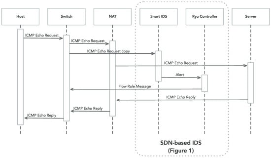 Figure 5 gives further details about how our solution operates in the presence of a DDoS attack driven by User Datagram Protocol (UDP) flooding and originated in a compromised internal host. We assume that the SDN controller has already installed a rule in the switch that normally forwards packets that originated from that host. We now explain the diverse processing steps a packet follows within our proposal. First, the ICMP Echo Request arrives to the switch. Then, the switch forwards the ICMP Echo Request to NAT. The switch mirrors with some latency (this depends on the internal switch fabric) the ICMP Echo Request to the Snort IDS. While NAT forwards the ICMP Echo Request to the Server and waits for the ICMP Echo Reply, the Snort IDS in parallel analyzes the ICMP Echo Request by means of a statistical function. If Snort considers that the processed packet has a statistically incorrect behavior, then the source node of that packet is classified as a malign host. Then, the IDS notifies the SDN controller about that via the Unix Domain Socket. After this, the controller mitigates the attack by sending a rule to the switch that blocks future packets that originated from the discovered malign host. Hence, after receiving the previous dropping packet rule, the switch can protect the network resources against the malign packets as well as protecting the remote server from that attack. Nevertheless, the switch suffers from a slight processing overhead due to the mirroring function. However, it is worth noting that this overhead is not so relevant in our domestic scenario.