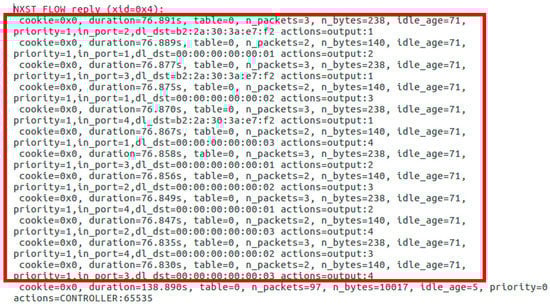 We now present and discuss the obtained evaluation results. After some packets were exchanged within the network, using the pingall Mininet command, the switch updated its flow rule table, as shown in Figure 6. We can verify that new rules were updated within the switch’s Flow Table with priority=1. Using these flow rules, the switch has the normal behavior of a legacy switch that learns the MAC address of each host and binds it to the switch’s port that has last received a frame from that host.