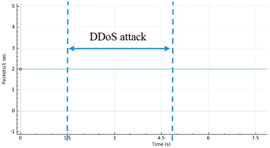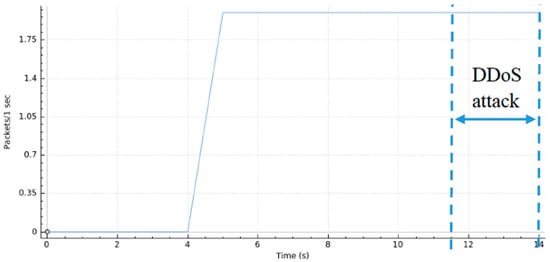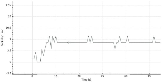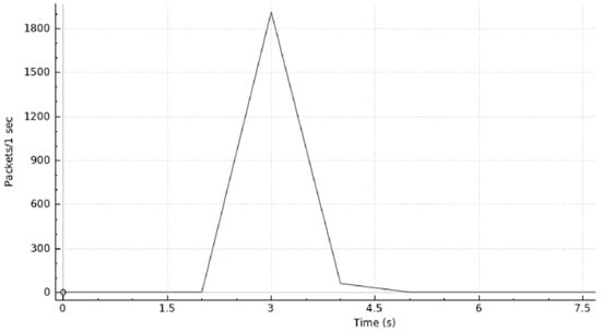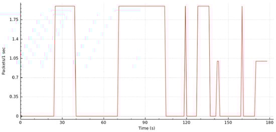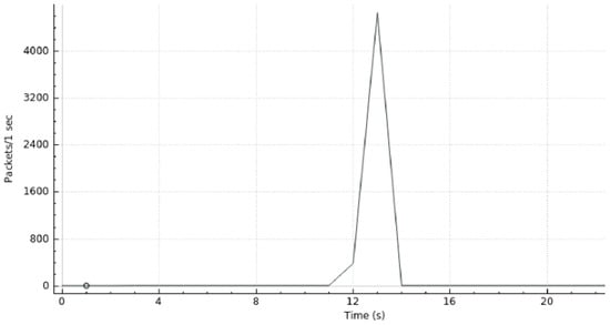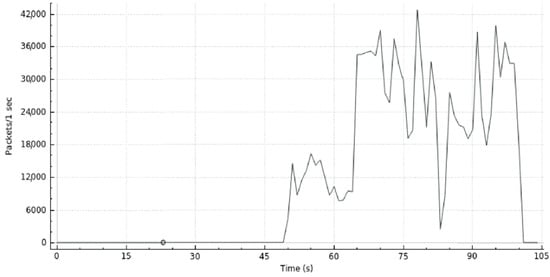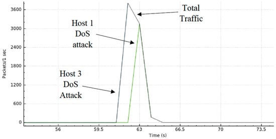 A graphical representation of the DDoS attack is shown in Figure 12 where we can see the traffic generated as a function of time. Here, one can observe the normal usage of the system during the first 60 s. Then, host 3 launches a DoS attack (first peak of packets transmitted per second). Next, host 1 launches another DoS attack (second peak of packets transmitted per second), simulating the DDoS attack. The DDoS attack was nearly mitigated at 64 seconds. Hence, from then on, we can verify that the network stabilizes around its “normal” operating status.