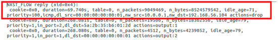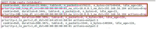 When the system detects an attack, it starts the mitigation phase. To mitigate the attack, our proposal transfers some flow rules to the local switch (Figure 10). In fact, one can check that our proposal reacts to the attack through the initial two rules displayed at the head of the flow table of the local switch. These two new rules with high priority values drop the received packets from both malicious users, host 1 and host 3.
