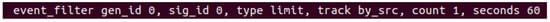 Our solution only blocks the malicious mirrored traffic after it was detected the first time. Therefore, Snort was configured to limit the logging events for 60 s (Figure 11). In this way, the controller only deals with a single alert within that period, avoiding the controller overload. This configuration to limit the number of alerts was defined in the file threshold.conf.