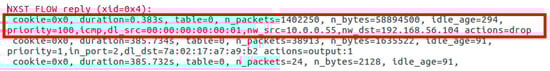 We can confirm that the mitigation process is taking over by checking the switch’s flow rule table (Figure 14). We can verify that the controller mitigated the attack through the first two lines of the Table. It consists of a new rule with higher priority to drop packets for the malign host (priority=100, actions=drop, dl_src=00:00:00:00:00:01, nw_src=10.0.0.55 and nw_dst=192.168.56.104).