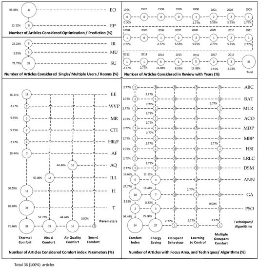 To answer RQ1, we have extracted the following relevant information from each article: (1) algorithm/technique, (2) focus area, (3) energy prediction, (4) energy optimization, (5) thermal comfort, (6) visual comfort, (7) air quality comfort, (8) sound comfort, (9) air quality, (10) temperature, (11) humidity, (12) illumination, (13) airflow, (14) heat radiation/flow, (15) cloth thermal insulation, (16) metabolic rate, (17) water vapor pressure, (18) single user, (19) multi-user, (20) individual room, (21) external environment. Appendix B, Table A2 discusses detailed information about these parameters. For the calculation of frequencies of each parameter and algorithms and techniques, comfort index, and frequency of publications from each year, we have carried out systematic mapping using the bubble technique reported in [19].