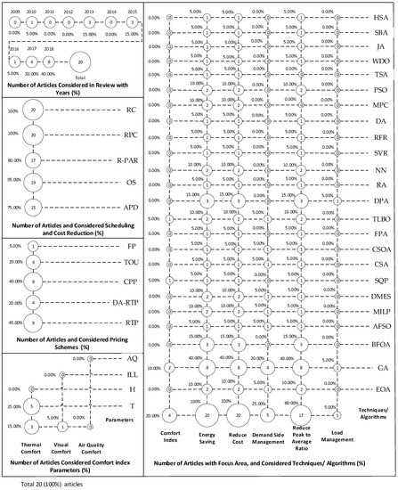 The data of Appendix B, Table A2, has been used for the systematic mapping; same can be seen in Figure 2 [19]. The other relevant information regarding the percentage of each technique, parameters, and so forth, was saved in an Excel sheet and elaborated upon in Figure 2 for the optimization techniques. The frequency of the articles included from each year is also provided with their percentage for better understanding and systematic extension. The definition of the abbreviations used in the parameter portion of the map is provided in the note portion of Appendix B, Table A2 and the remaining are provided as: particle swarm optimization (PSO), genetic algorithm (GA), artificial neural network (ANN), decision support model (DSM), linear reinforcement learning controller (LRLC), heuristic system identification (HIS), model-based predictive control strategy (MBP), Markov decision problems (MDP), ant colony optimization algorithm (ACO), multinomial logistic regression (MLR), bat algorithm (BAT), and artificial bee colony (ABC).