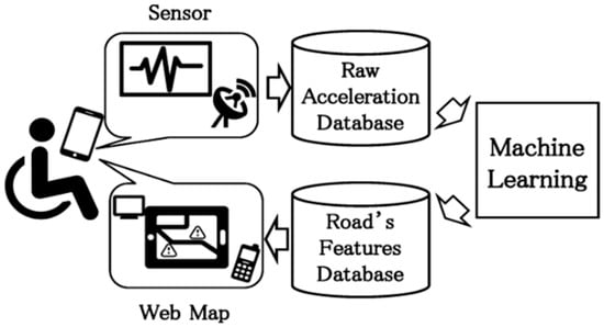The simplest type of accessibility visualization utilizing human sensing is simple wheelchair trails [13]. Such trails provide practical information for wheelchair users regarding wheelchair accessible roads and facilities. The information is useful but not sufficient. The trail approach provides the fact that someone could pass there, but not all wheelchair users can pass in the same way. The physical abilities of wheelchair users are more diverse than generally imagined; there are users like Paralympic athletes, and some users may damage their bodies with only a few vibrations. Important information for wheelchair users is the physical state of the road surface, such as the angle of the slope of the sidewalk, height of curb, roughness of the road surface, and so on. This information about the physical state of the road surface is not only helpful for wheelchair users to make decisions of access/avoidance of the roads according to their physical conditions and abilities, but also all people with difficulties in moving in the same way. The information about the physical state of the road is the foundation of the road accessibilities. This paper hereinafter calls this information the road accessibility information. The purpose of this paper is to propose a system for providing this road accessibility information by human sensing and machine learning techniques.