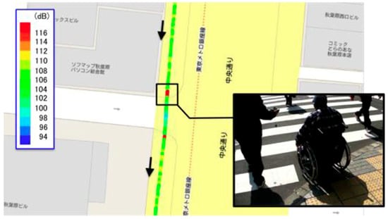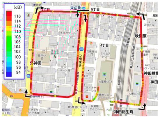 To find a higher VAL on the route intuitively, we separated the moving route represented on the Google map by every 0.02 s, and each part of the route was painted with one of 13 colors according to the averaged VAL value, i.e., red color for a VAL value over 116 dB. Notice that the location data obtained from the GPS receiver was revised by hand carefully to remove the multipath effect.